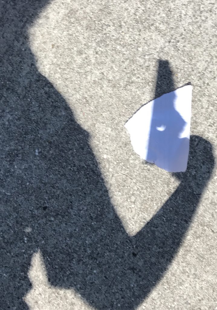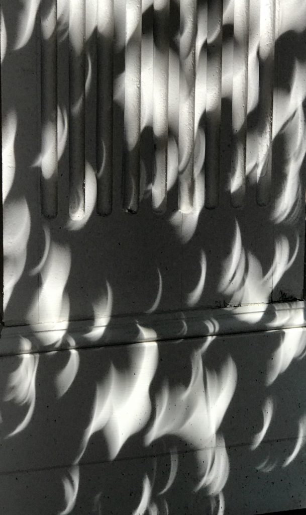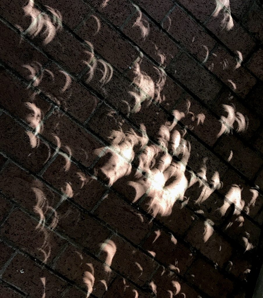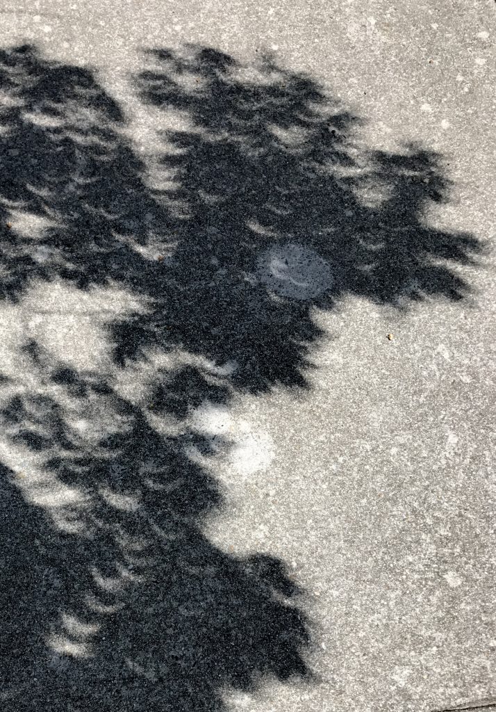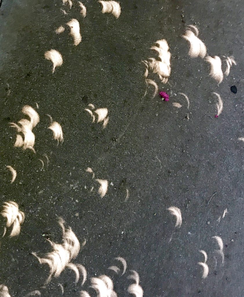 Abandoning the rest of my supplies in the classroom, I grabbed eclipse glasses, iPhone, and keys and scurried across the street. I stopped along the way to take photos of the crescent-shaped shadows created as the leaves in the trees became myriad pinhole projectors.