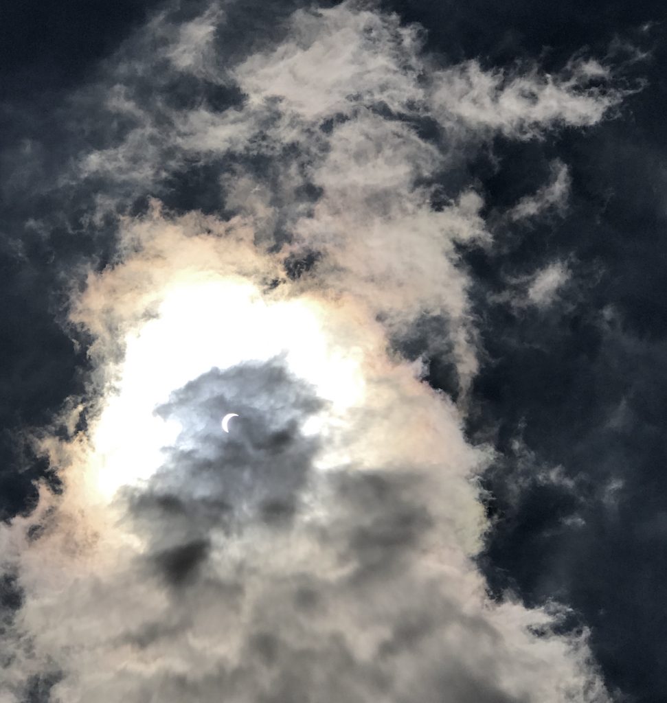 I expected to see hundreds of students crowded into the courtyard in front of the gazebo but found only six. Four girls were huddled together, looking up at the sky and vainly attempting to photograph the eclipse while shading their eyes with their smart phones. As I found a bench where I could place my things, they exclaimed something about a cloud, and I looked through my glasses toward the partially obscured sun. I took a chance on a photograph, and the moment of serendipity provided me the image with which I began this post.