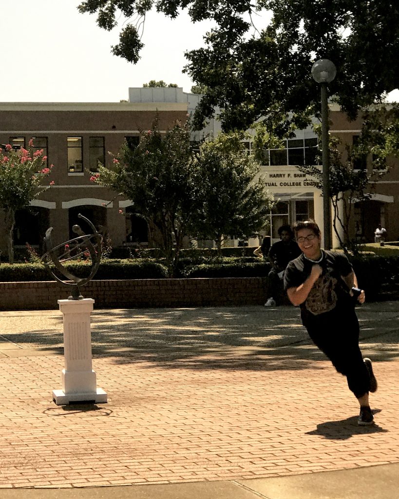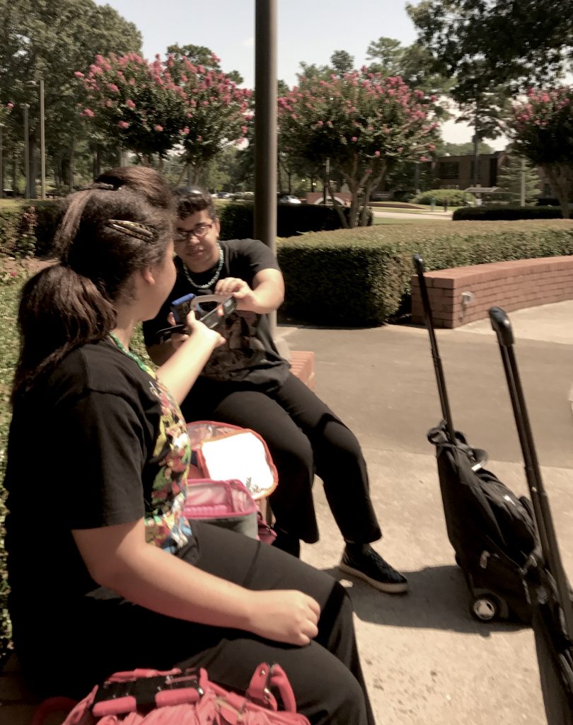 Two girls were sitting on the bench beside me. I overheard their narration as they tried to take videos of the eclipse. And then I heard one of them shout, “This is majestic!” I turned and asked them if they would like to share my glasses, and they were delighted. I was likewise delighted to be near them. Their eagerness to see and learn and experience was palpable and infectious. I called over the other four girls to share my glasses as well, and they were duly impressed. But the reactions of my companions on the bench were at another level entirely. They eagerly passed the glasses back and forth to me and between themselves. One even ran in primal celebration around the sundial–the sundial!–in the center of the courtyard because she thought it was a compass somehow mystically aligned to the astronomical wonder she was experiencing.