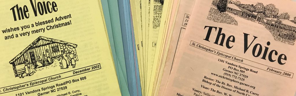 For about six years, I produced a monthly newsletter entitled “The Voice” for the tiny congregation at St. Christopher’s Episcopal Church. I included a message from the vicar, parish news with photos, a calendar of birthdays and anniversaries, happenings around the Anglican communion, and a children’s puzzle pages. And I generally wrote my own meditation of the sort that has made keeping a blog so seductive an occupation. I produced the bifold pamphlet without the aid of a desktop publishing program, cut and arranged the pages, ran them off on pastel paper with our photocopy machine, and folded, stapled, stamped, and mailed them. It was a gift-based ministry that gave me much satisfaction.