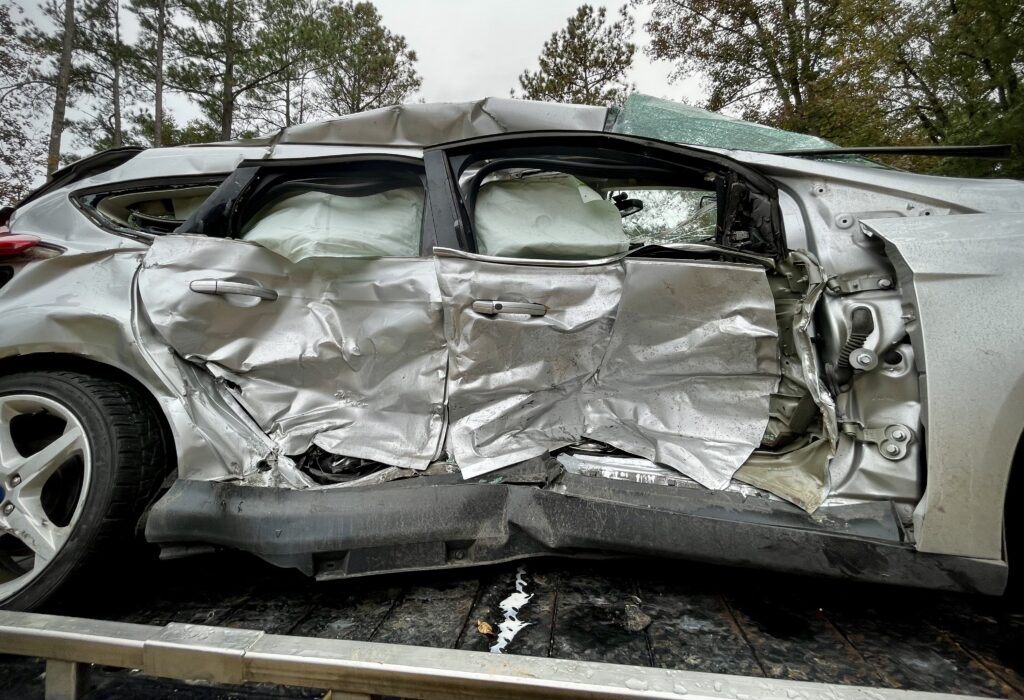 I am told that around 8:00 p.m. on October 28, 2022, I had a car accident. Empirical evidence certainly supports such a hypothesis. If the picture alone isn’t enough, I can report that I had extensive bruising between my knees and on both breasts, a minor liver laceration with internal bleeding, and an Uber ride home from the emergency room wearing only a hospital gown (dress stolen, bra cut off) and blue hospital socks (shoes remained in the car). I received a substantial payoff for my car, which was a total loss, and a verdict of “case dismissed” from the magistrate of the Hoke County traffic court. Oh, and as recently as yesterday I still managed to find little pieces of shattered safety glass in the pocket of my leather jacket.