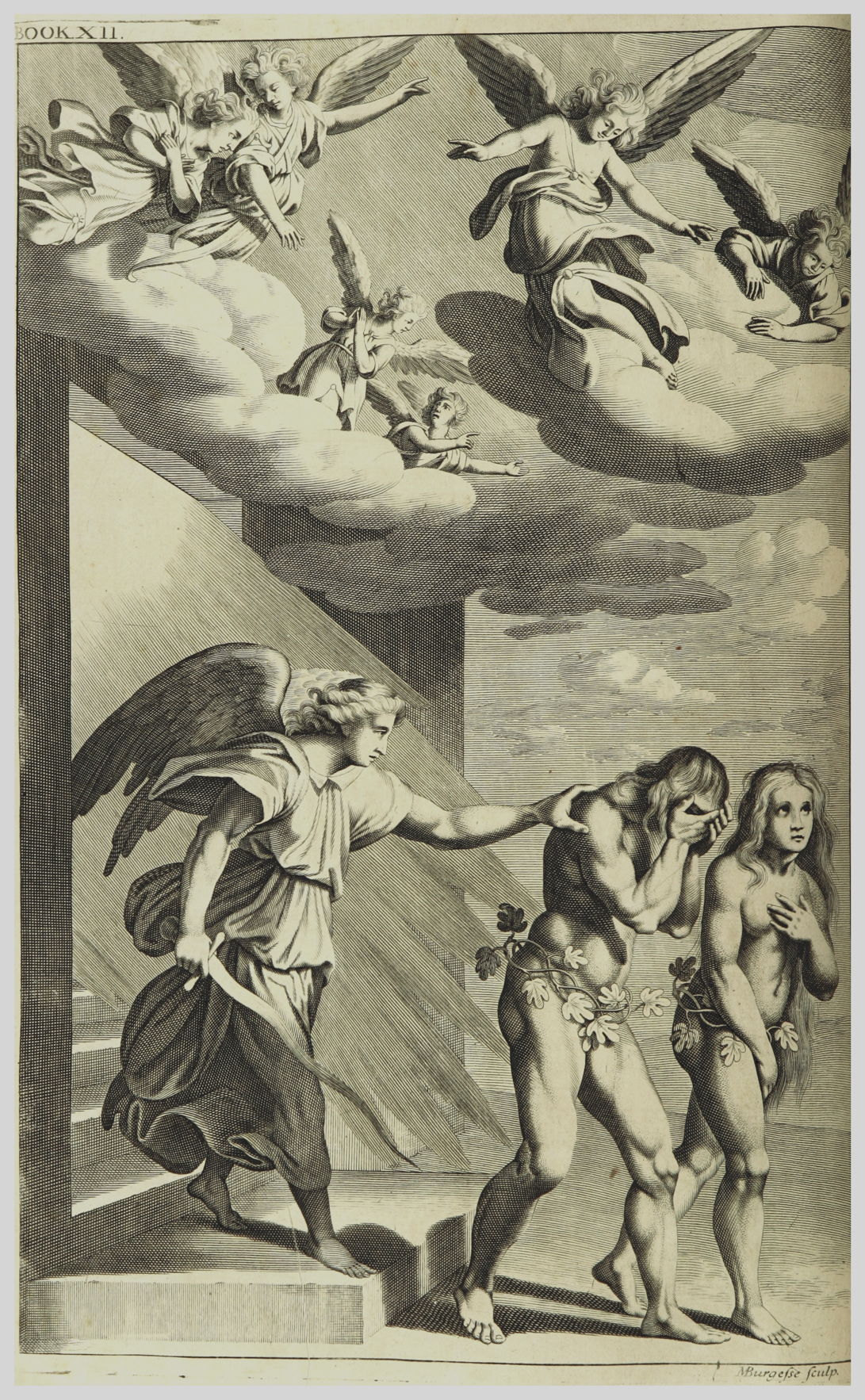 I am drawn to the engraving below from a 1695 edition of Paradise Lost (artist unknown) as a fuller expression of my theme of the “fortunate fall”; those beneficent angels overseeing the expulsion from the garden pair perfectly with Milton’s immortal closing lines: